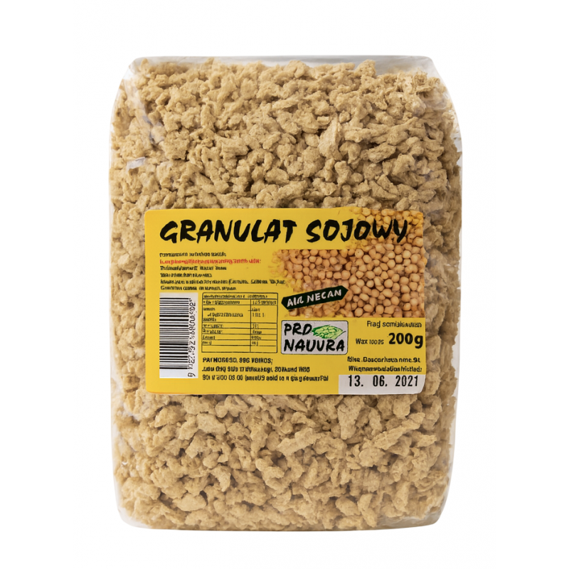 OPISGranulat sojowy to produkt roślinny przeznaczony dla osób na diecie wegańskiej lub wegetariańskiej. Nie zawiera składników pochodzenia zwierzęcego. Granulat sojowy jest produktem bezglutenowym.