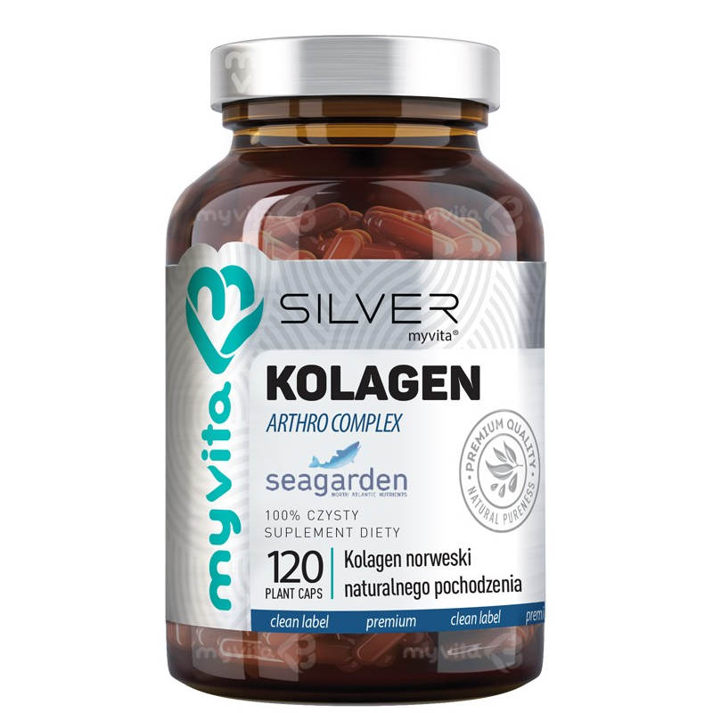 OPISPreparat składa się wyłącznie z aktywnych składników bez sztucznych dodatków i wypełniaczy. Zawiera naturalny, hydrolizowany kolagen morski, glukozaminę, witaminę C i kwas hialuronowy, a skład został wzbogacony o leucynę, aminokwas pochodzący z białka. Wszystkie składniki zostały zamknięte w roślinnej kapsułce bez barwników. Kolagen znajdujący się w produkcie serii MyVita Silver to najwyższej jakości kolagen hydrolizowany wytwarzany z dorsza dziko żyjącego w czystych wodach północnego Atlantyku. Przetwarzaniem surowca, w specjalnym procesie zapewniającym zachowanie wszystkich wartości odżywczych, zajmuje się norweska firma SeaGarden. Kolagen hydrolizowany to najlepsza forma kolagenu, ponieważ taki surowiec wykazuje najwyższą stabilność, a jego cząsteczki są małe, dzięki czemu jest wysoko przyswajalny. Kolagen to niezwykle istotny składnik w organizmie. Stanowi blisko 30% zawartości wszystkich białek. Jest elementem, który łączy ze sobą komórki, a więc jest niezwykle ważny przy prawidłowej budowie narządów wewnętrznych, naczyń krwionośnych, zębów, kości oraz skóry. Wspiera także procesy regeneracji stawów, dzięki czemu przyczynia się do utrzymania układu ruchu w dobrej kondycji. Wraz z wiekiem produkcja kolagenu zostaje zaburzona. Więcej cząsteczek obumiera niż jest produkowanych przez organizm, dlatego należy zadbać o to, by w naszej diecie było go jak najwięcej.