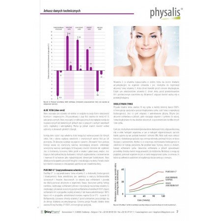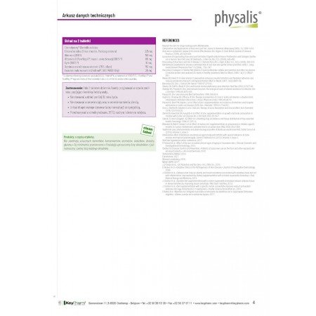Wąkrota azjatycka przyczynia się do dobrego krążenia krwi w skórze. Ponadto Physalis Perfect Skin zawiera witaminę C (PureWay-C®), która wspomaga prawidłową syntezę kolagenu. Witamina C, cynk i aloes dodatkowo przyczyniają się do ochrony komórek przed wolnymi rodnikami. Na koniec, kompleks ten zawiera również Holimel®, SOD (dysmutazę ponadtlenkową) pochodzącą z koncentratu francuskiego gatunku melona (Cucumis melo) i krzem roślinny pochodzący z bambusa. Nie należy przekraczać zalecanej porcji do spożycia w ciągu dnia. Suplement diety nie może być stosowany jako substytut zróżnicowanej diety i zdrowego trybu życia.
