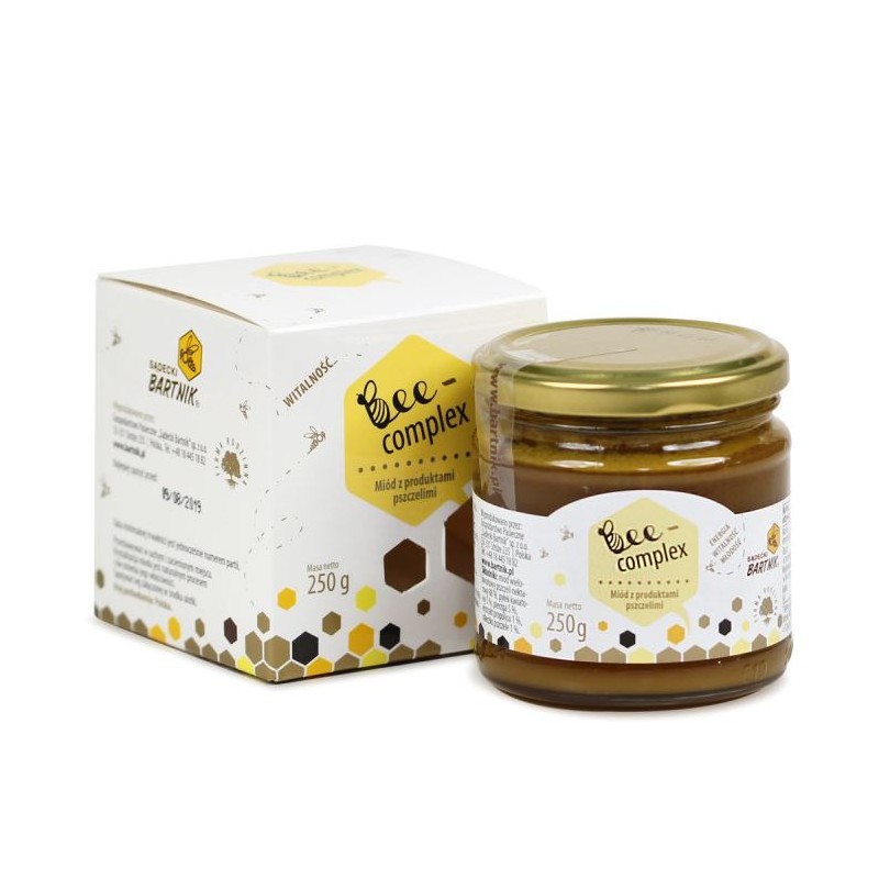 Bee-Complex - miód z produktami pszczelimi. Precyzyjnie zbilansowane połączenie biologicznie aktywnych produktów pszczelich: pyłku kwiatowego, pierzgi, propolisu i mleczka pszczelego. Składniki spaja miód wielokwiatowy, zapewniający ich maksymalne wchłonięcie przez organizm człowieka.