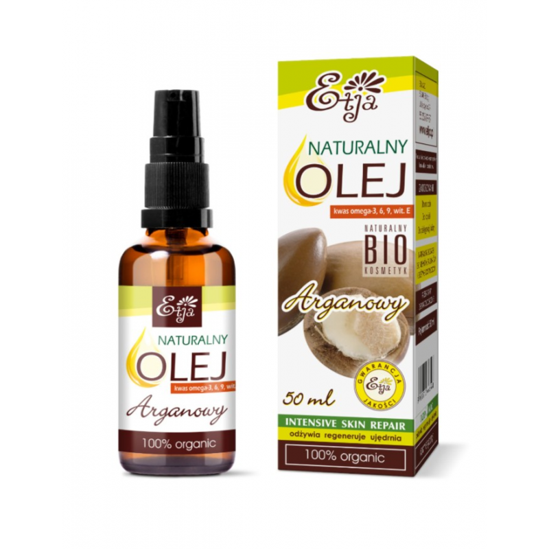 100% naturalny, nierafinowany olej tłoczony wyłącznie na zimno ze świeżych orzechów drzewa arganowego pochodzących z upraw ekologicznych. Posiada lekko pomarańczowe zabarwienie o charakterystycznym lekko gorzkawo-orzechowym zapachu. Bogaty w nienasycone kwasy tłuszczowe około 80% głównie w linolowy omega-6 i oleinowy omega-9, witaminę E, butyrospermol pielęgnujący skórę przed i po opalaniu.