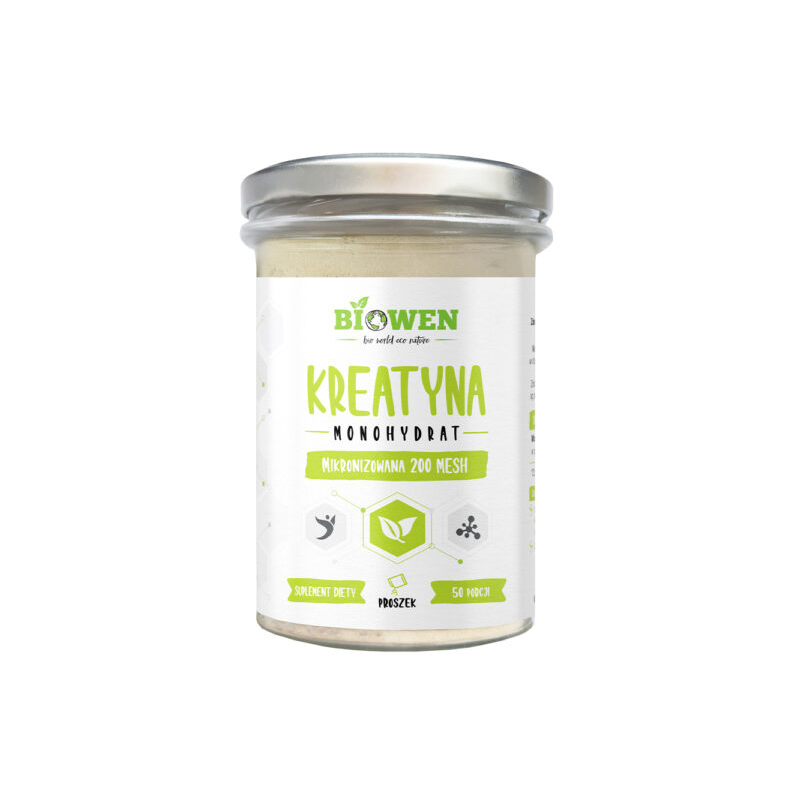 OPISKreatyna Monohydrat Mikronizowana 200 MESH Biowen to czysty, przebadany monohydrat kreatyny o wysokiej jakości. Mikronizacja sprawia, że kreatyna lepiej się wchłania i szybciej działa. Wspiera wzrost siły, wytrzymałości i efektywność podczas krótkich, intensywnych treningów. Produkt jest wolny od metali ciężkich i bezpieczny w stosowaniu.