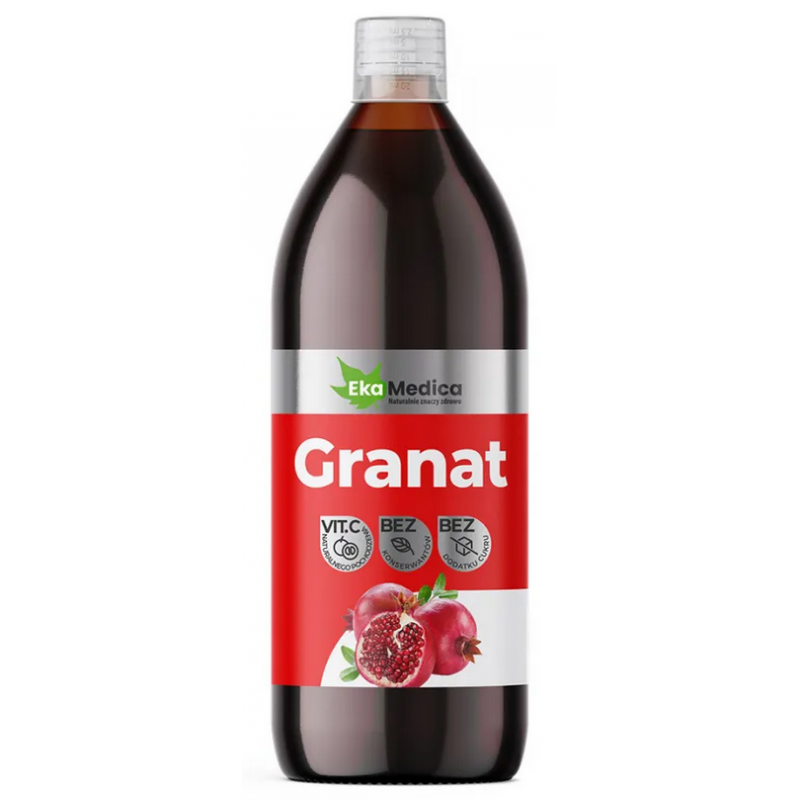 Suplement diety w formie płynnej, wyprodukowany z soku 100% z owoców granatu z dodatkiem naturalnej witaminy C pochodzącej z ekstraktu z owoców camu-camu. Pasteryzowany. Bez dodatku cukru - zawiera naturalnie występujące cukry.