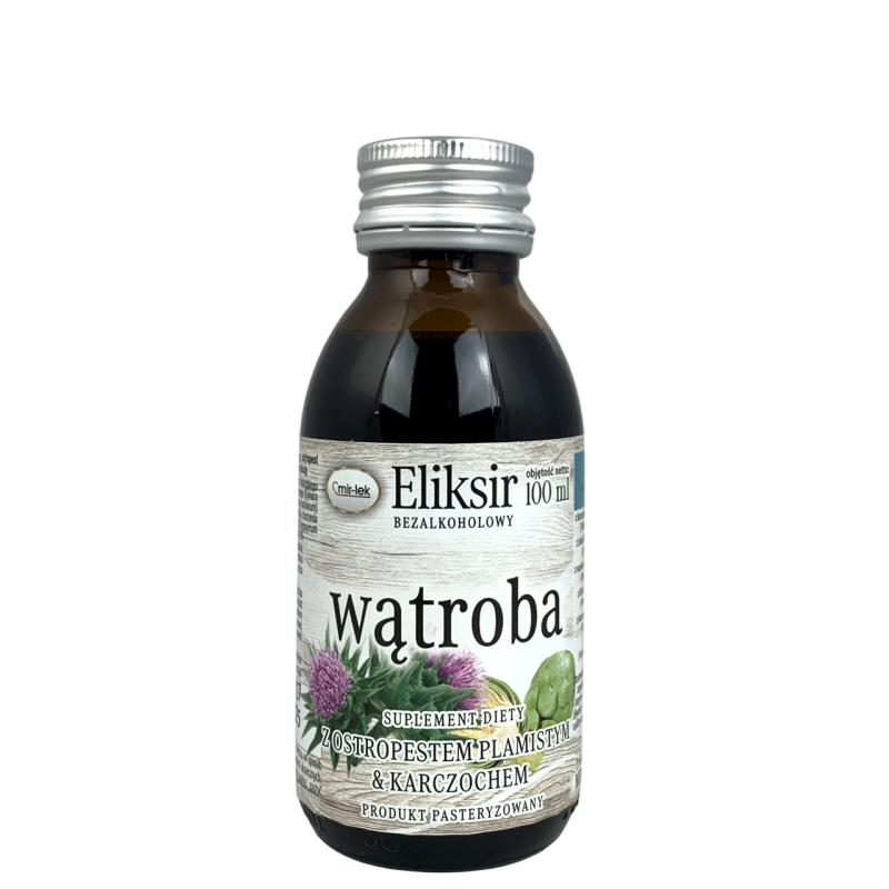 OPISELIKSIR bezalkoholowy 100 ml WSPARCIE WĄTROBY - Suplement diety z ostropestem plamistym i karczochem. Mniszek lekarski wspiera pracę wątroby i pomaga w prawidłowym jej funkcjonowaniu. Produkt pasteryzowany. SKŁADNIKIWyciąg z roślin 50% :[ z korzenia mniszka lekarskiego (Taraxacum officinale) 30%, z ziela karczoch zwyczajnego (Cynara scolymus) 20%, z nasion ostropestu plamistego (Silybum marianum) 20%, z liści babki lancetowatej (Plantago lanceolata) 15%, z korzenia cykori podróżnik (Cichorium intybus) 10%, z łuski gryki (Fagopyrrum esculentum) 5%], woda 47%, sok z cytryny (Citrus limon) 3%.Składniki aktywne w porcji 5 ml:Wyciągi wodne 1:1:• Mniszek lekarski korzeń Taraxacum officinale - 0,75 g• Karczoch zwyczajny ziele Cynara scolymus - 0,5 g• Ostropest plamisty nasiona Silybum marianum - 0,5 g• Babka lancetowata liść Plantago lanceolata - 0,375 g• Cykoria podróżnik korzeń Cichorium intybus - 0,25 g• Łuska gryki Fagopyrrum esculentum - 0,125 g