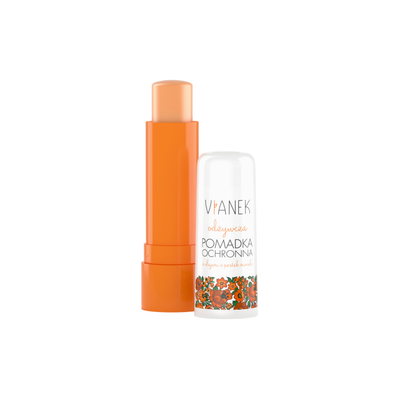 OPISODŻYWCZA POMADKA OCHRONNA z olejem z pestek moreliPomadka ochronna zawierające odżywcze oleje (z pestek moreli, rokitnikowy, sojowy, jojoba), wosk pszczeli oraz masła (kakaowe, shea) doskonale nawilża i natłuszcza usta, zapobiegając ich wysychaniu i pękaniu. Pomadka posiada smakowity zapach mango i brzoskwini.SPOSÓB UŻYCIApomadkę stosować kilka razy dziennie.INCIGlycine Soja Oil, Hippophae Rhamnoides Oil, Simmondsia Chinensis Seed Oil, Prunus Armeniaca Kernel Oil, Cera Alba, Butyrospermum Parkii Butter, Theobroma Cacao Seed Butter, Lanolin, Carnauba Wax, Parfum.