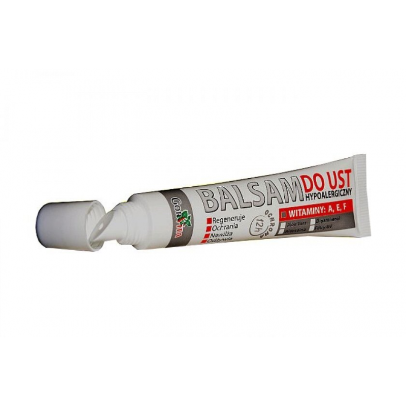 OPISBalsam do ust hypoalergiczny z witaminami A,E,F działa nawilżając na spierzchnięte usta. Łagodzi podrażnienia wywołane infekcjami bakteryjnymi, zimnem i promieniowaniem UV. Przyspiesza regenerację. Ochrania przed szkodliwym działaniem czynników zewnętrznych.